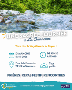 Viens fêter la Vie jaillissante de Pâques à La Courneuve ! Le 5 avril 2026, les religieuses du Sacré-Cœur t’invite à célébrer la joie de la Résurrection avec une messe à 10h30 en l’église Saint-Lucien, suivie d’une journée de prières, de rencontres et d’un repas festif !